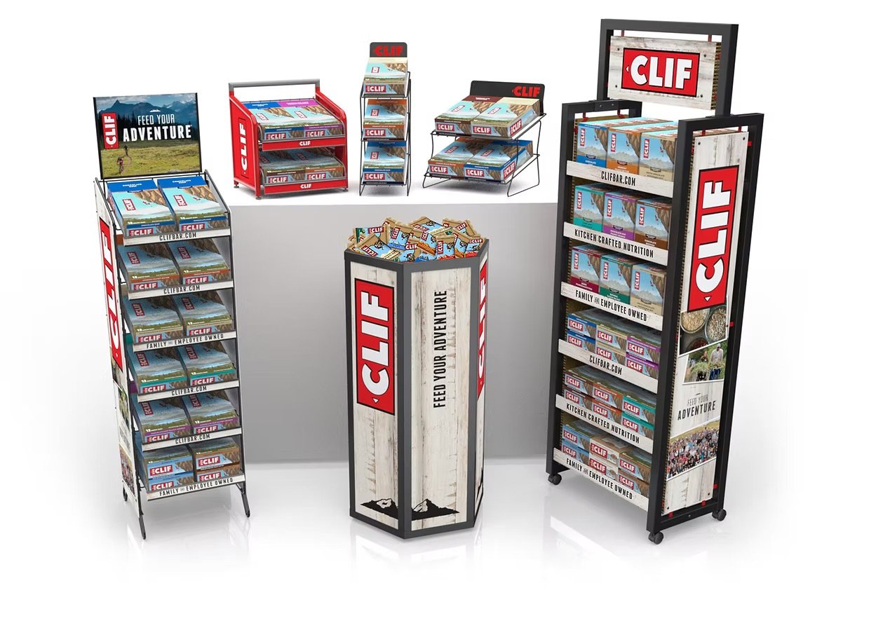This durable, high-capacity rolling floor display brings maximum product visibility and brand presence to busy retail environments. The wire shelf design and bold red powder-coated steel frame make restocking easy and keep CLIF product lines organized and shoppable at-a-glance.