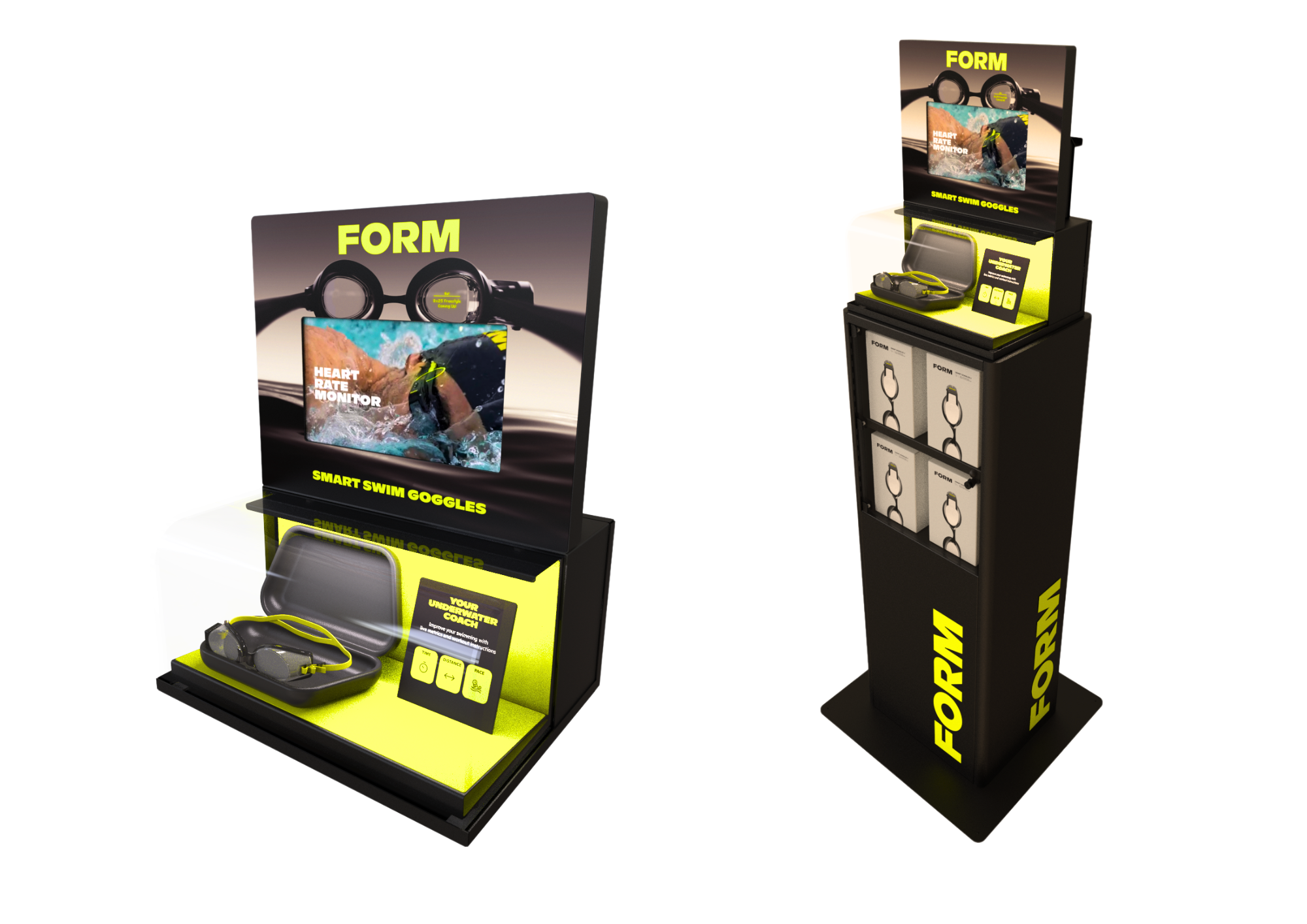 This compact, high-impact display for FORM Smart Swim Goggles turns any endcap or countertop into a standout product showcase. Featuring a live product under acrylic, branded visuals, and packaging bays, the display helps translate advanced performance features into retail engagement and conversion.