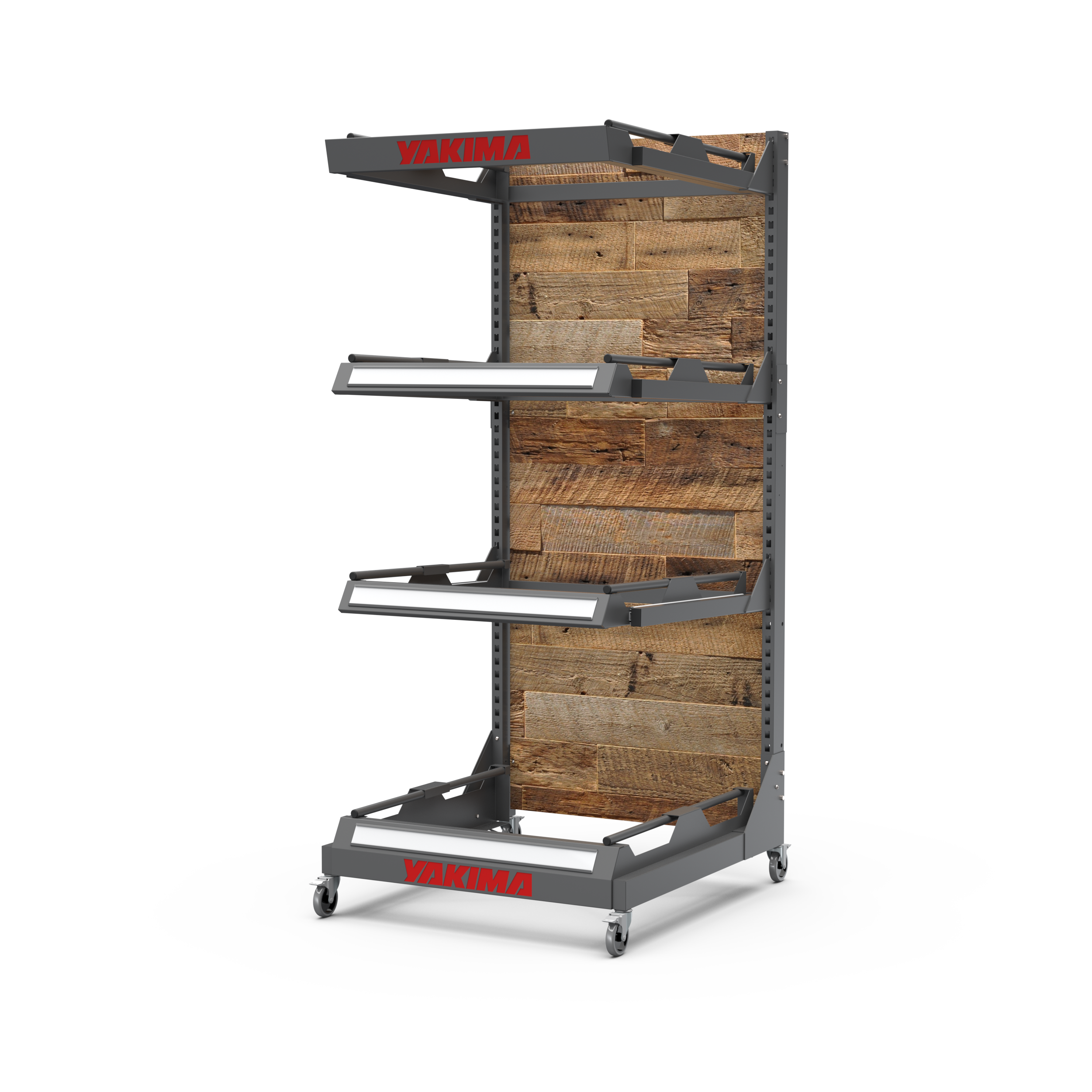 This vertical wall-mounted display efficiently showcases multiple Yakima cargo boxes in a compact footprint. Designed to maximize visibility and storage education, it allows shoppers to compare size, fit, and style side-by-side. The wood backdrop adds a rustic, outdoor aesthetic, aligning with the brand’s adventurous tone while creating an impactful presence in automotive and outdoor retail environments.